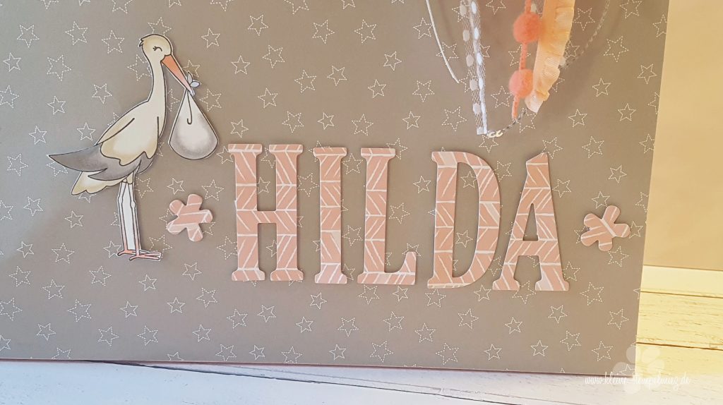 Unten habe ich aus Designerpapier in Blütenrosa aus dem Set „Traumhaft Tropisch“ mit Hilfe der großen Buchstaben Framelits den Namen der kleinen Prinzessin gestanzt. Daneben kam der Storch aus dem Set „Precious Delivery“, den ich mit Stampin‘ Blends coloriert habe.