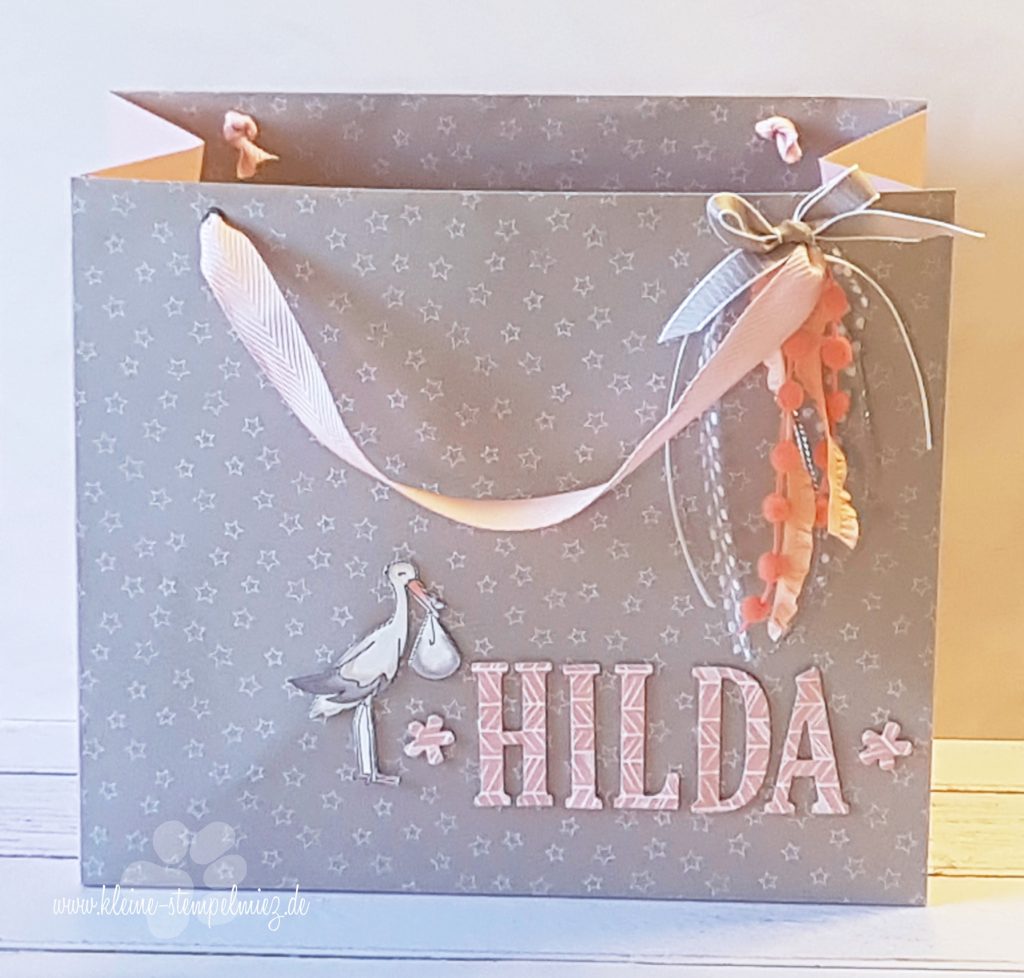 gestern habe ich euch die Karte zur Geburt für meine Kollegin gezeigt. Heute habe ich die dazu passende Geschenktüte, die ich für die kleine Hilda gewerkelt habe. Die Anleitung habe ich von Jasmin von Stempeldochmal. Allerdings habe ich die Maße etwas angepasst, damit auch wirklich alle Geschenke hinein gelegt werden konnten.