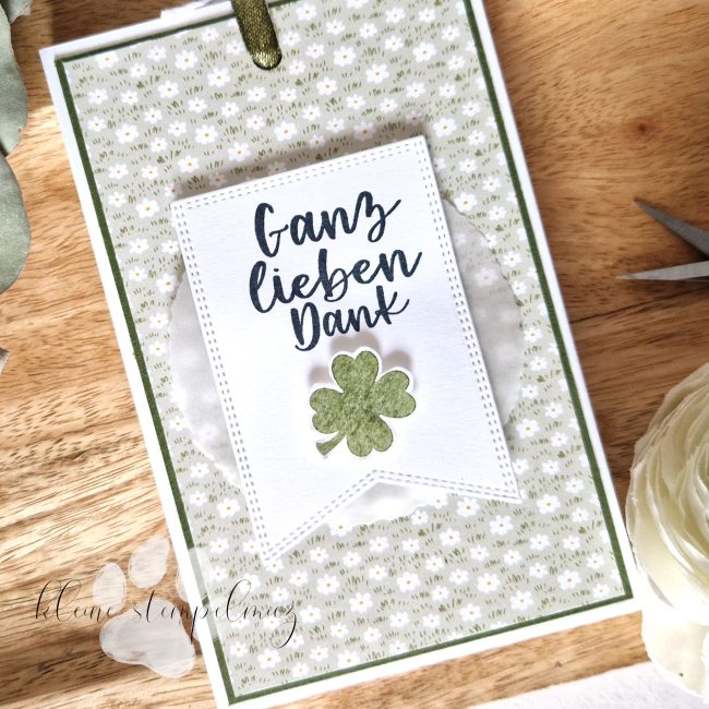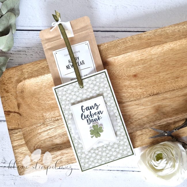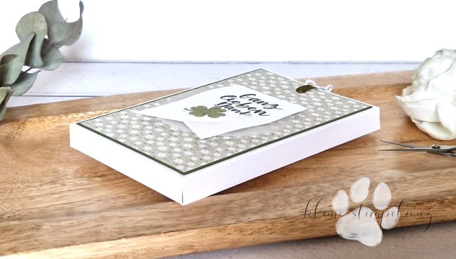 Die Grundverpackung habe ich aus Grundweiß Karton gefertigt und vorn eine Mattung aus Waldmoos Cardstock und Designerpapier „Käfer & Co.“ aufgelegt. Anschließend kam ein Büttenkreis aus Pergamentpapier und ein Wimpel aus Grundweiß Karton drauf. Der Dankesspruch stammt aus dem Set „Eine runde Grüße“ und wurde in Schwarz gestempelt. Das Kleeblatt wurde in Waldmoos gestempelt und kommt aus dem Set „Good Luck“. Ich habe es mit einer Schere ausgeschnitten und mit Dimensionals aufgeklebt.